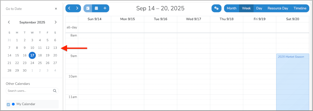 The Day Selector will slide in from the left when selected. Clicking on any day in the Day Selector will take you to that day in the main calendar.