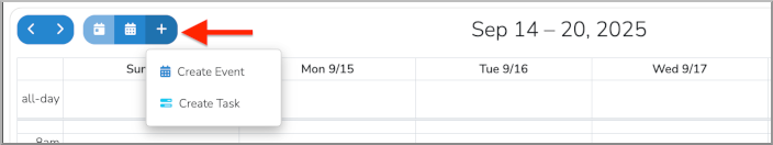 You can create a new Event or Task by highlighting a day and time range in the calendar itself of by selecting the "+" icon at the top left.