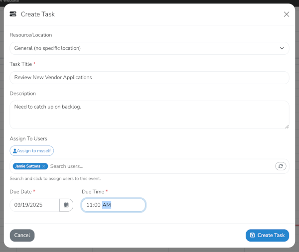 Just as you can create a calendar event entry you can also create a calendar task for yourself or any member of your extended team.