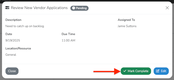 To market the Task complete you can simply click on it and select "Mark Complete".