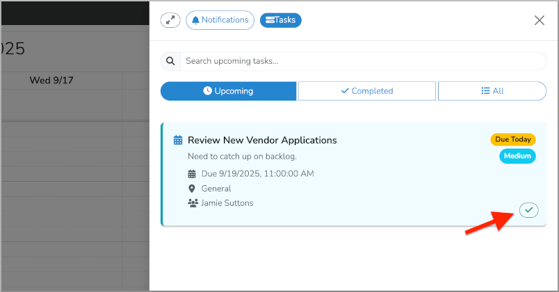 This will open your Notifications as shown below. You can also quick complete a Task from Notifications by clicking on the green checkbox button at the bottom.