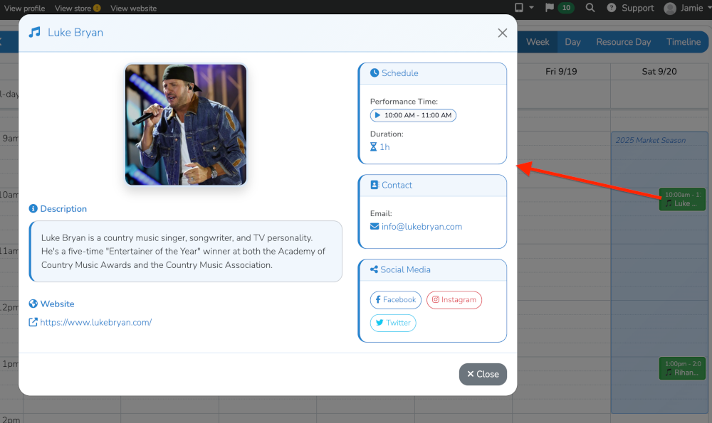 If you click on one of the "Activities and Performers" in calendar it will show you the details as shown below.